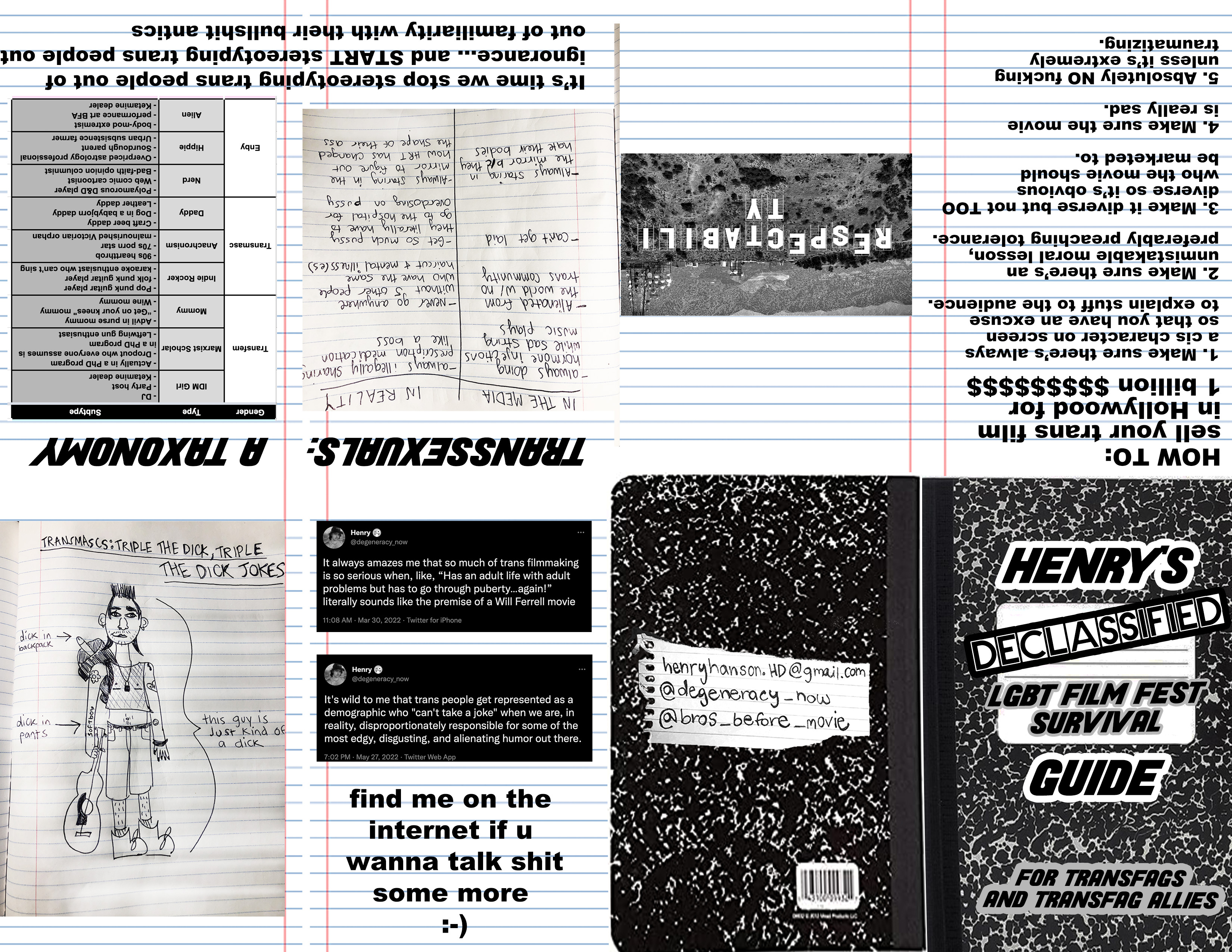 I have a love/hate relationship with (North American) LGBT fests but my short film Bros Before got into a few of them and I said yes because I just want it to get seen by anyone willing to watch it. I decided that if I was going to attend these film festivals, though, I was at least going to make a dumb, cheeky zine poking fun at them and leave them lying around everywhere. It’s mostly based on my experiences watching the trans shorts blocks at LGBT fests over the past several years (some of which ended up being the container for my film, lol). I thought it was really dumb and annoying how most of the shorts about being trans were, like, edutainment for cis people – all flawless heroes and suicidal melodrama. To be fair, it’s not entirely the fault of the film festivals. For reasons that are totally beyond me, many people have chosen to make movies like this. But I think that it’s impossible to separate trends in art from the gatekeepers of its distribution. So I’m gonna pick on the powerful institutions here instead of the artists.