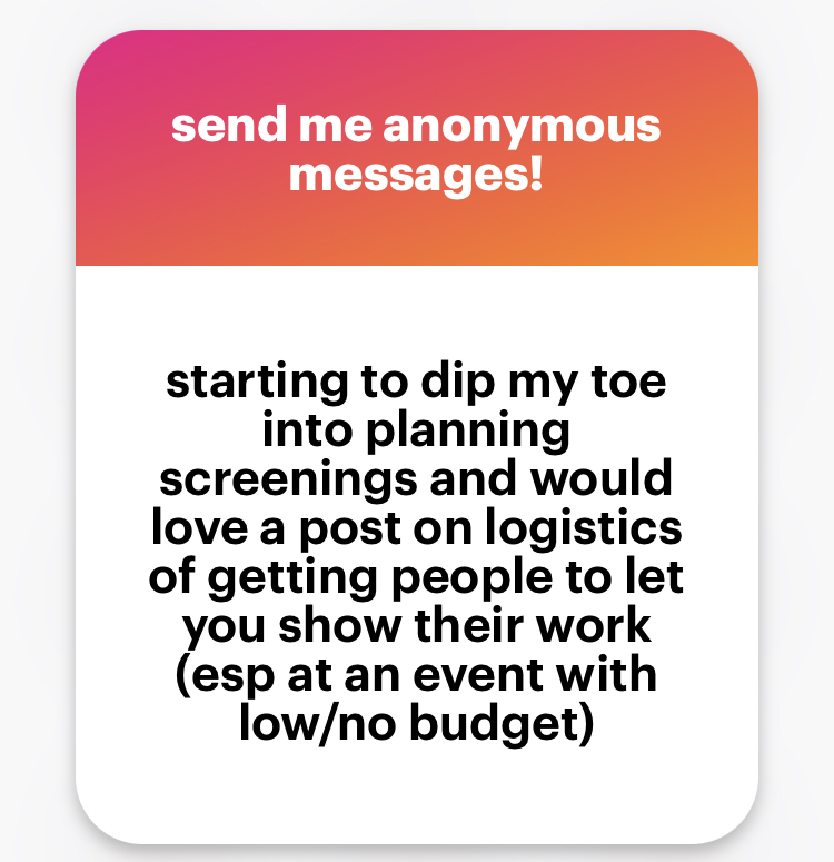 - Open submissions. I’d be remiss to not discuss this option, even though I personally don’t tend to do this. The vast majority of things that get programmed (at festivals or otherwise) are things that get solicited from artists, not from open submissions. I have been a screener for a large film festival, and it’s a shitton of work to sort through a bunch of submissions that are usually not very good. As a small independent programmer doing open submissions, though, you’re likely to have the opposite problem. You’re probably not gonna get that many submissions because you’re not necessarily on people’s radars (the ones you do get will probably still be mostly bad though). It takes a lot of work and outreach to promote a call for open submissions and I figure it’s a better use of my limited time to search for things to directly solicit using the methods mentioned above . I’m absolutely missing out on hidden gems by not doing open submissions, but it’s never been worth it to me in the larger calculus of maximizing my limited time and resources. Also, I keep my DMs open year-round with a note in my bio for people to send me their screeners. This happens extremely infrequently, reinforcing my belief that open calls are not very useful.